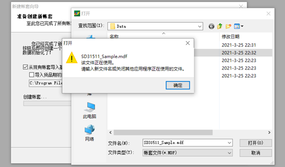 速达软件:5 系产品在做新建账套“年结”引入原有账套时,提示: *** 该文件正在使用